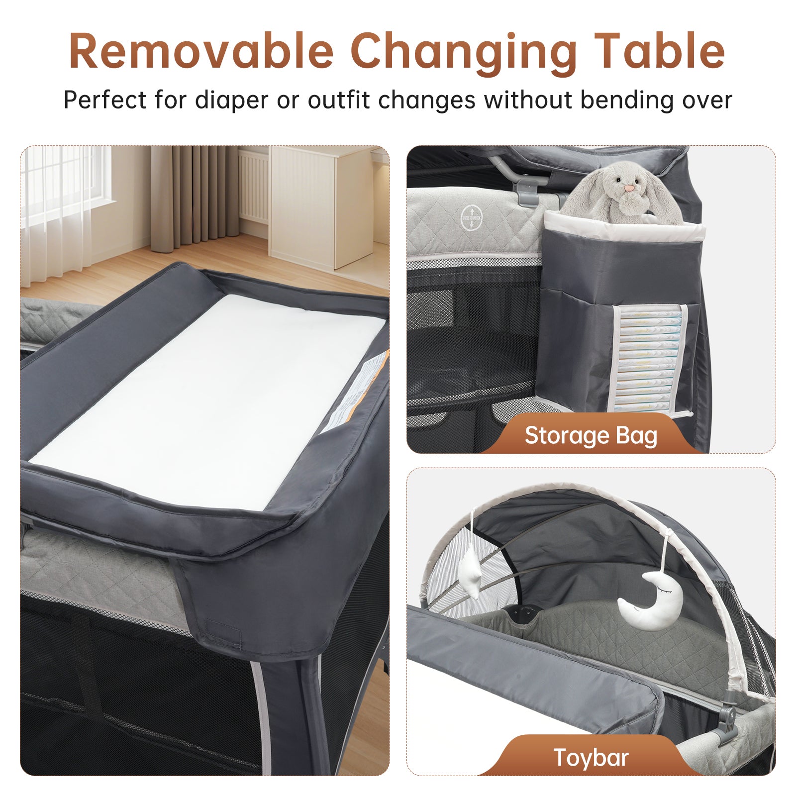 - ✨ Multi-Functional Design: The Vipsafe Baby Playard is the ultimate all-in-one solution for parents. It combines five essential features: a comfortable bassinet, a removable changing table for easy diaper changes, a convenient bedside sleeper, a storage bag for baby essentials, and an engaging activity center. Perfect for resting, playing, and changing, it provides everything you need in one compact unit.