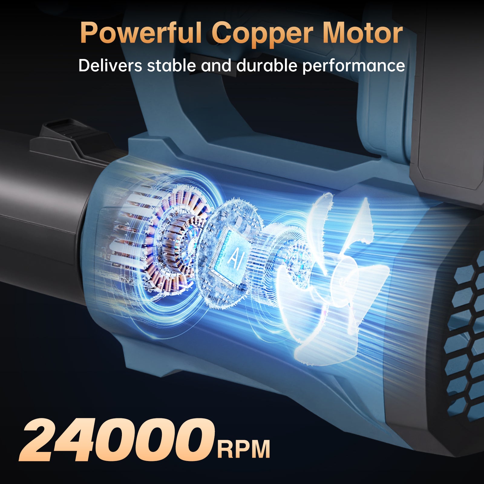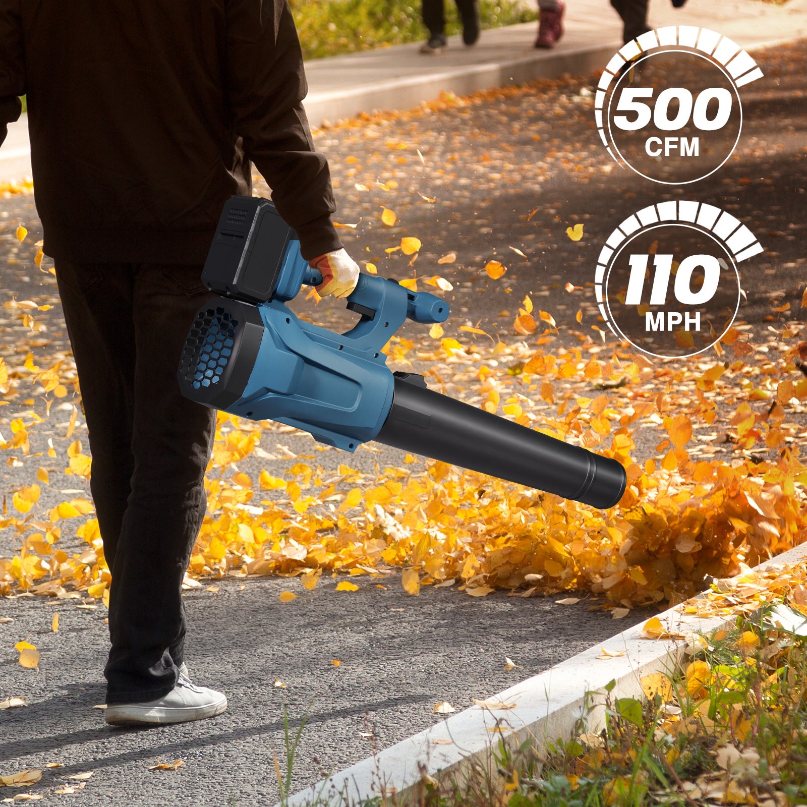 - 🚀 Powerful Turbo Motor: Equipped with a high-efficiency motor running at 24,000 RPM, combined with turbo technology, it delivers 500 CFM airflow and 110 MPH wind speed—perfect for quickly clearing leaves, dust, and stubborn debris.