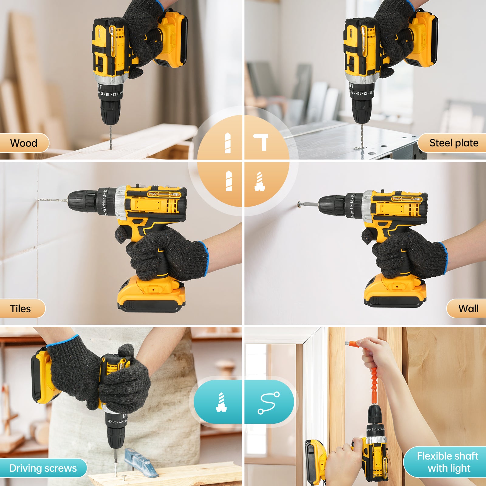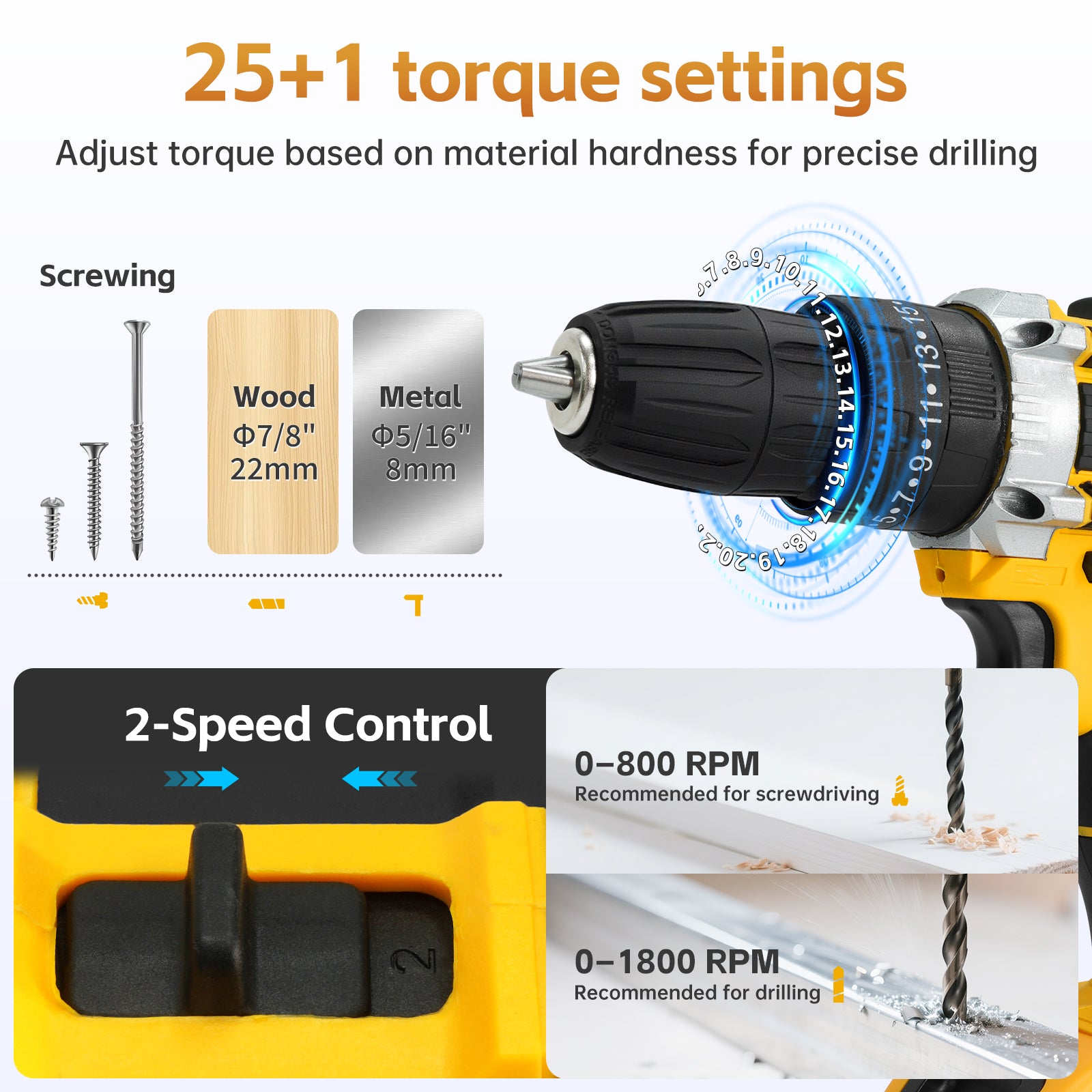 With 25+1 clutch settings and two-speed control (0–800RPM & 0–1350 RPM), you can fine-tune the torque to match any material—from soft wood to hard metal. This flexibility ensures smooth, accurate results whether you’re working on delicate surfaces or heavy-duty drilling. -