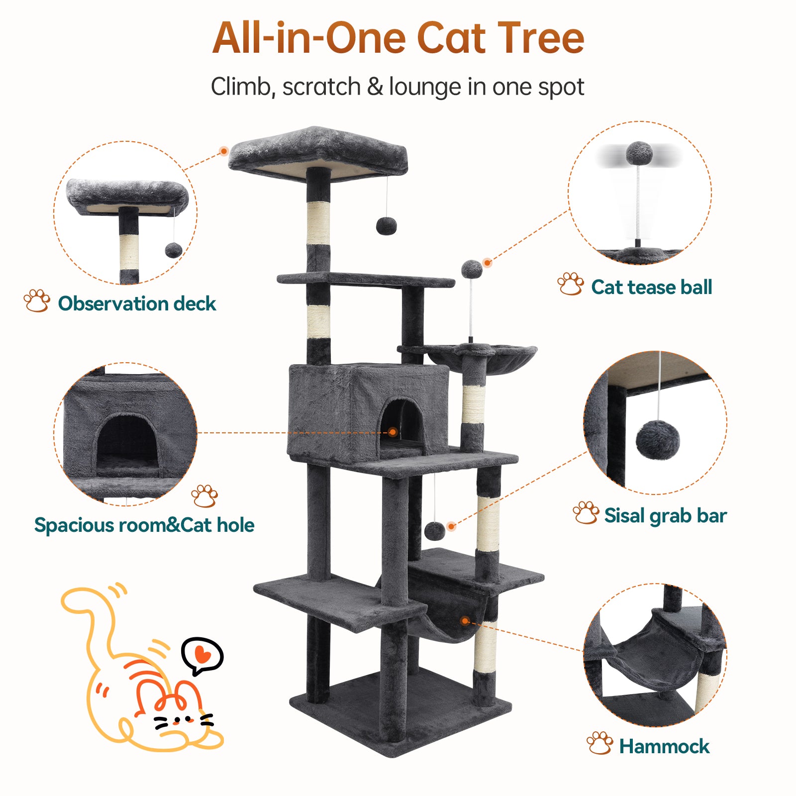 - 😸 Spacious Design: This 63.8-inch tall cat tree features 6 levels, a cat condo with two double-door entry holes, five sisal-covered vertical scratching posts, two cozy hammocks, and a raised cat perch. With overall dimensions of 18.81 x 19.69 x 64.57 inches, it provides ample play and rest space without taking up too much room.