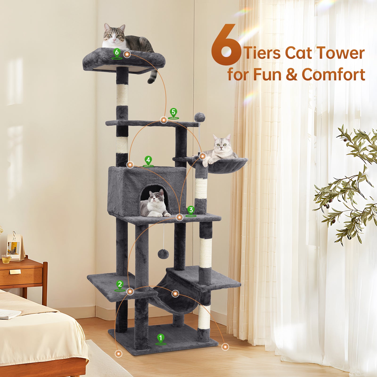 Vipsafe 63.8-Inch Cat Tree with 6 Tiers, Sisal Scratching Posts, Toys, and Cozy Bed for Indoor Cats