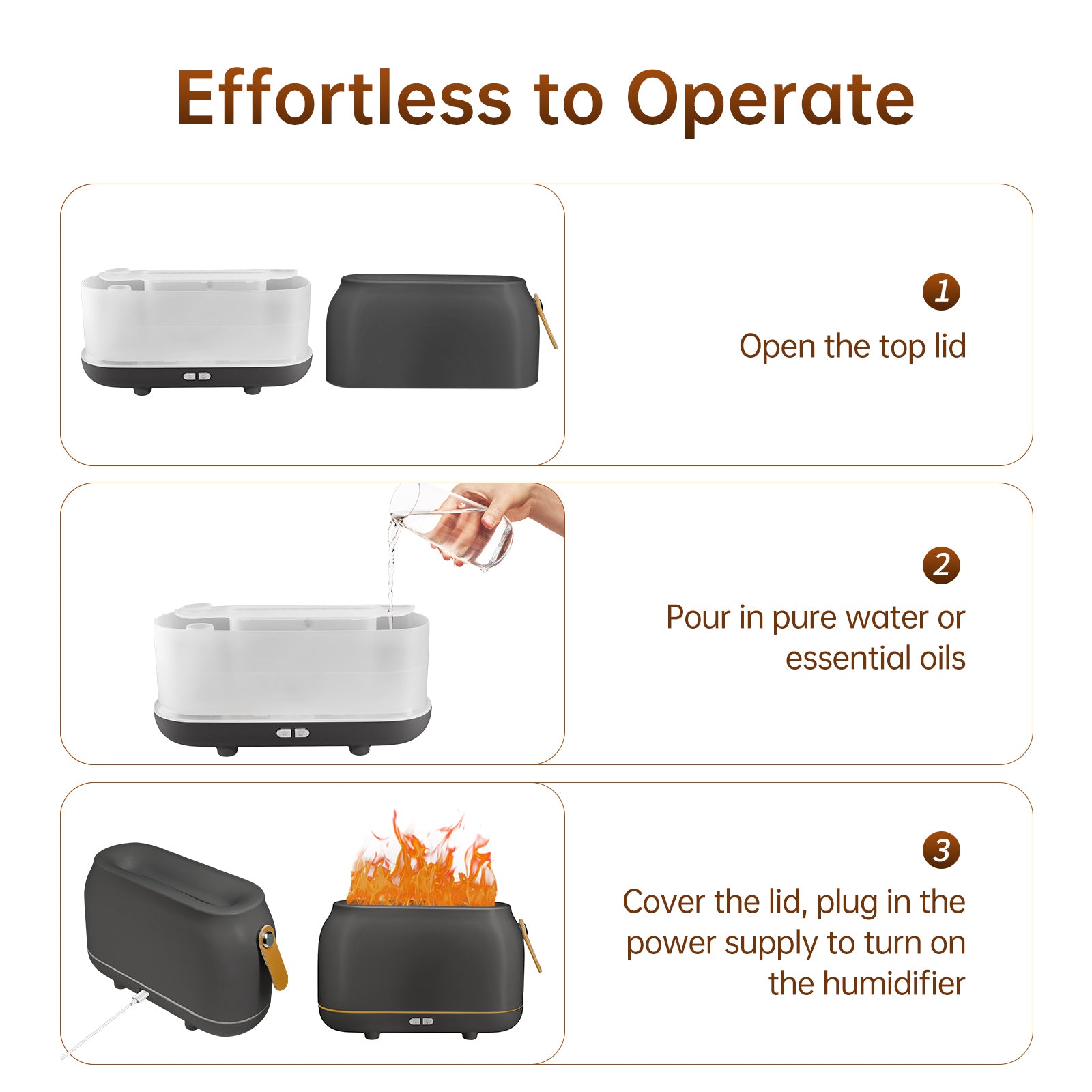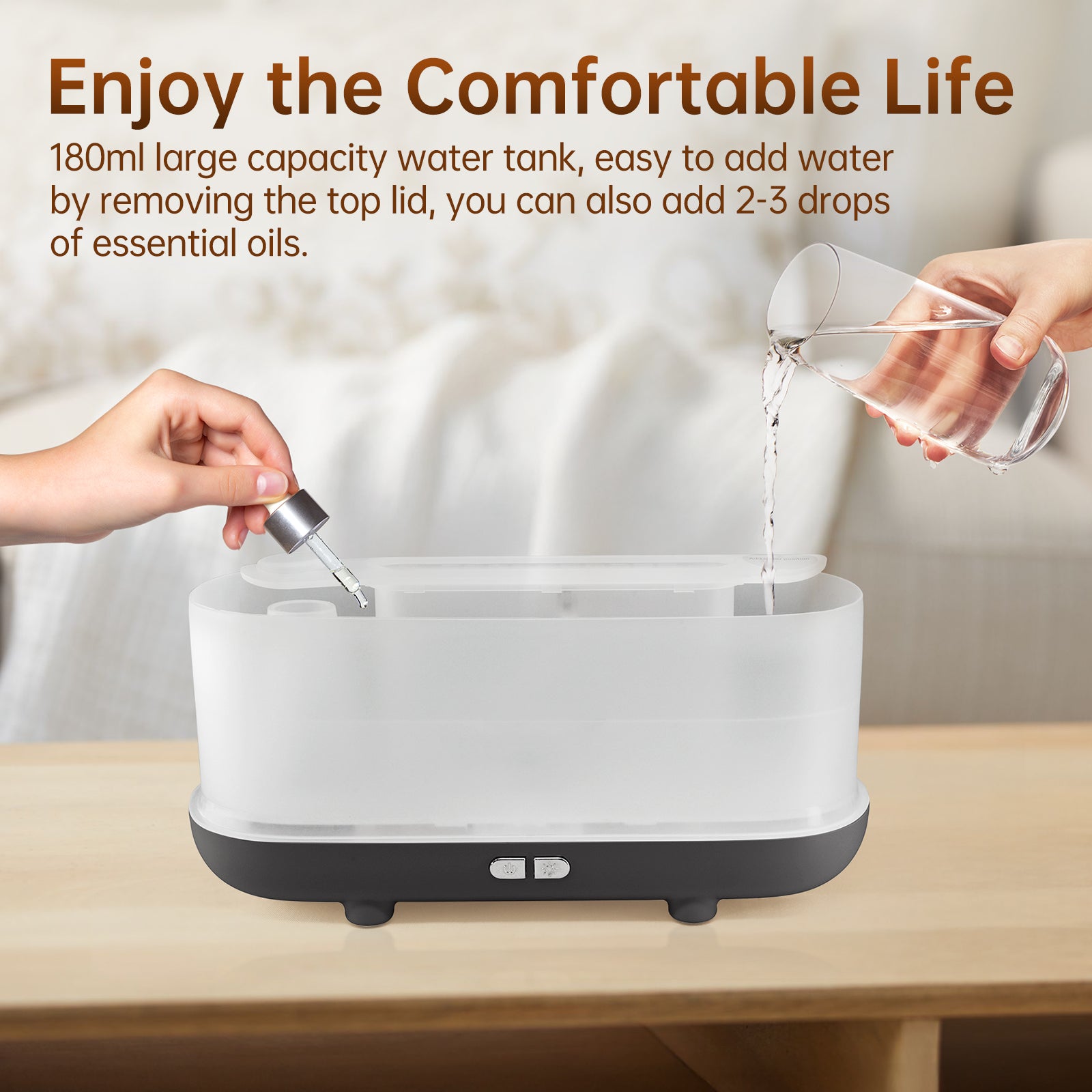 - Simulated flame lighting effects: This flame diffuser humidifier is a collection of light and mist, 3-colour variable light effects to create a realistic flame effect, while sending out a fine water mist, just the right degree of wetness.