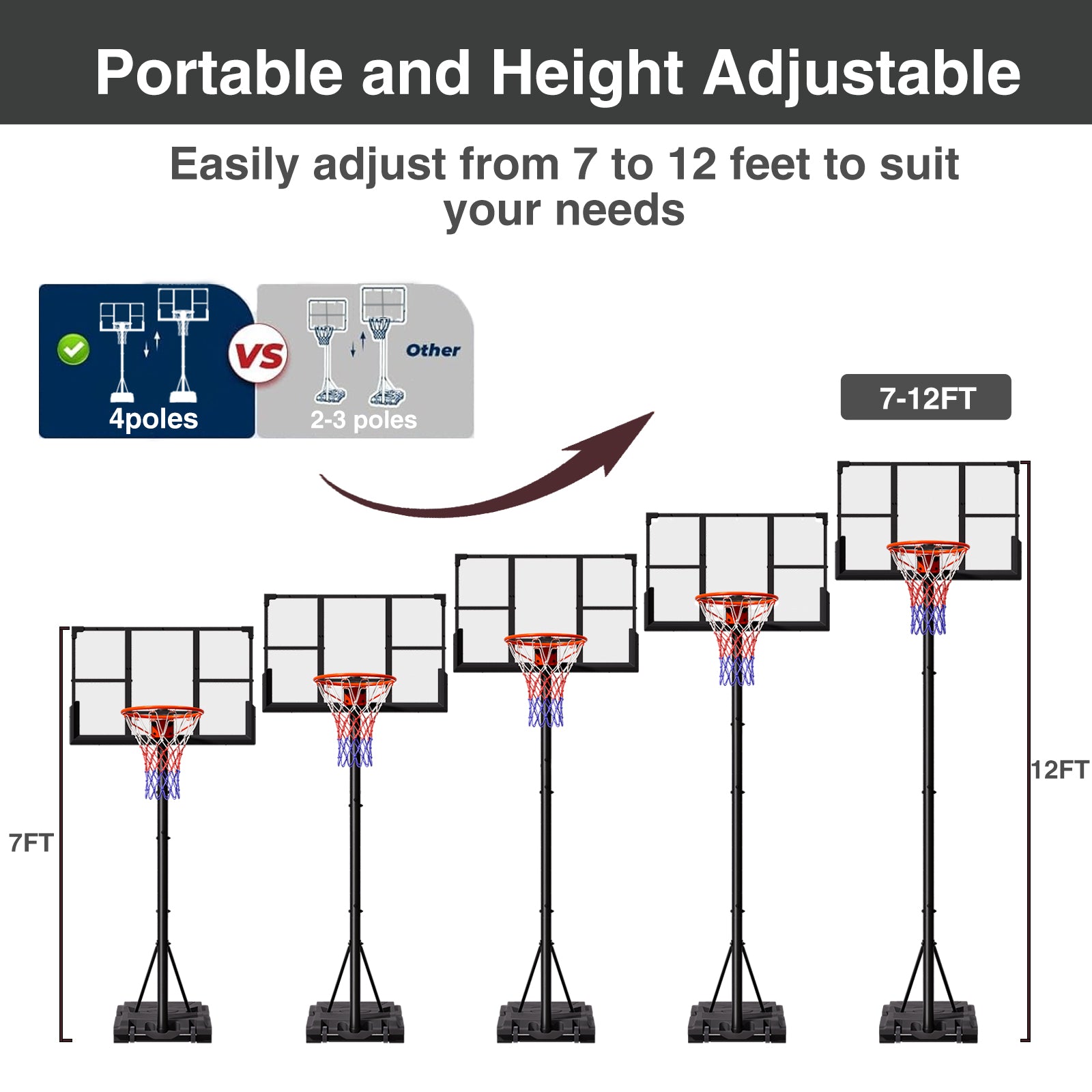 Easily adjust the hoop from 4.8 to 9.7 feet with 5 levels for height adjustments without tools. Ideal for kids, teens, and adults, it is perfect for casual backyard fun or more competitive games in the driveway.