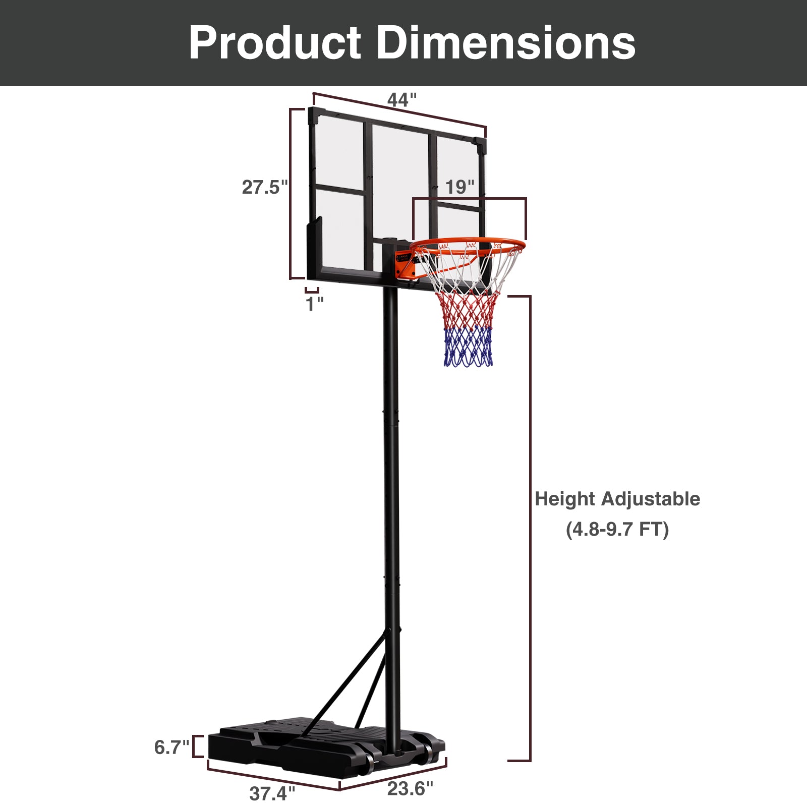 VIPSAFE 44-Inch Basketball Hoop System, 4.8-9.7 FT Height Adjustable for Kids Youth and Adults for Backyard, Driveway, Indoor Use